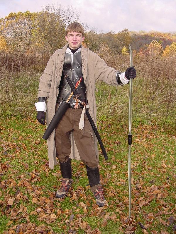 I slogged my way through the mud and scurried on up to the top of Mt. Doom. Because of the whole hunting situation, the perimeter was not yet in place, so I suspected that the "bottom of Mt. Doom" crew would probably take a pretty liberal interpretation of where they started. To their credit, however, I can confirm that at least some of them didn't stay in the parking lot. I took a picture of myself to prove that I was at the top <g>, then had a rice krispie bar to bolster my energy. I kept a close eye on my watch and shouted down to the people below when I thought there was two minutes to go, but they shouted up that my watch was off, the game was starting. I was not positive that I had successfully synchronized my watch with Bill (the second hand makes that difficult), so I took their word for it, but still gave myself an extra thirty seconds or so to be sure I wasn't starting early. On the way down the mountain, my sword managed to get unclipped from my belt, and the clip disappeared into the leaves. I carried the sword and sheath with me as I continued downwards until I reached the parking lot. There, I opened up the trunk of my car and got out some twine that was leftover from Operation Valar and just lashed the sheath to my belt the old fashioned way. While this was going on, I met up with John the Nazgul and the two "Evil Butterflies of Doom" (I didn't get the costume concept, but they got warg points supposedly). We got to the crossroads just in time to see Sauron running down the road towards the Long Lake Bridge. I knew he was en route to the Shire, so I didn't delay him.