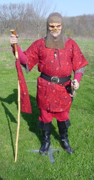 You'd think costuming would be a breeze, since I already had the Bilbo outfit. Alas no, because I had to figure out some way to protect my legs and feet (while remaining hobbitish), and I had to do something for Drew (who is even more costume-inept than I am). For myself, I bought a pair of soccer shinguards, over which I pulled a pair of men's costume hose. Fur proved surprisingly easy to affix to my softball cleats (which I heartily endorse for Ring Game play, by the way), and I added some toenail-like buttons to make them even more hobbitty. For Drew, I fell back on the old standby, "tunic over the chainmail." I found some fabric that was sort of a green version of the stuff I used for my Nazgul tunic, figuring that green could easily be used for an Elf, a Ranger, or a Rider of Rohan. I also designed buttons to cover each of these possibilities. Sunday afternoon, I called Jeff and begged for an additional Rivendell Elf (so Drew and I could at least start together), and he graciously gave it to me. So I didn't need to bother with other button designs, I just made Drew one with the crest of Gil-galad (to represent the Elves of Rivendell, you see). Drew wasn't exactly thrilled with being an Elf (the ungrateful bastard!), so I added "Boffo the Elf Boy" in Tengwar to his pin. In honor of the Rangers, I also made up some "Star of the Dúnedain" pins, with the lineage of Aragorn in Tengwar runes around the outside. It was pretty cool, actually. The following Tuesday night, I popped "Spartacus" into the DVD player and got to work sewing. Frankly, I think I did a pretty good job (although you can't really see the nifty work on the collar because of the chain mail--d'oh!).
