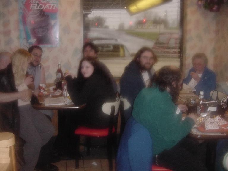 Partyin’Drew and I were able to get a ride back over to our car at Rivendell, and as we were de-costuming, I realized that the only way I could get my soaking wet socks off was to first take off my pants! D'oh! Dratted tights! And my suitcase was buried somewhere deep in the back of the car. So, I just left my wet shoes on as we drove to A&W. The crowd was pretty upbeat, although there were a few people there that were pretty down in the dumps. I'd planned to meet with Jeff and Bill at A&W to discuss Second Age, but I was desperate to get out of my wet things, so I asked Todd and Scott to convey my apologies. I chatted with a few people, but on the whole, it was my shortest A&W stop ever. From there, we went to the Dodgeville Wal-Mart, where I bought a pair of socks. When asked, "would you like a bag for that?" by the cashier, I replied, "No, but could you direct me to the Men's Room, I need to change into them." Mind you, I still had on my wig and vest and furry shoes at this point, but the guy very nicely directed me. I changed into the new socks and my regular tennies, and felt about a gazillion times better.